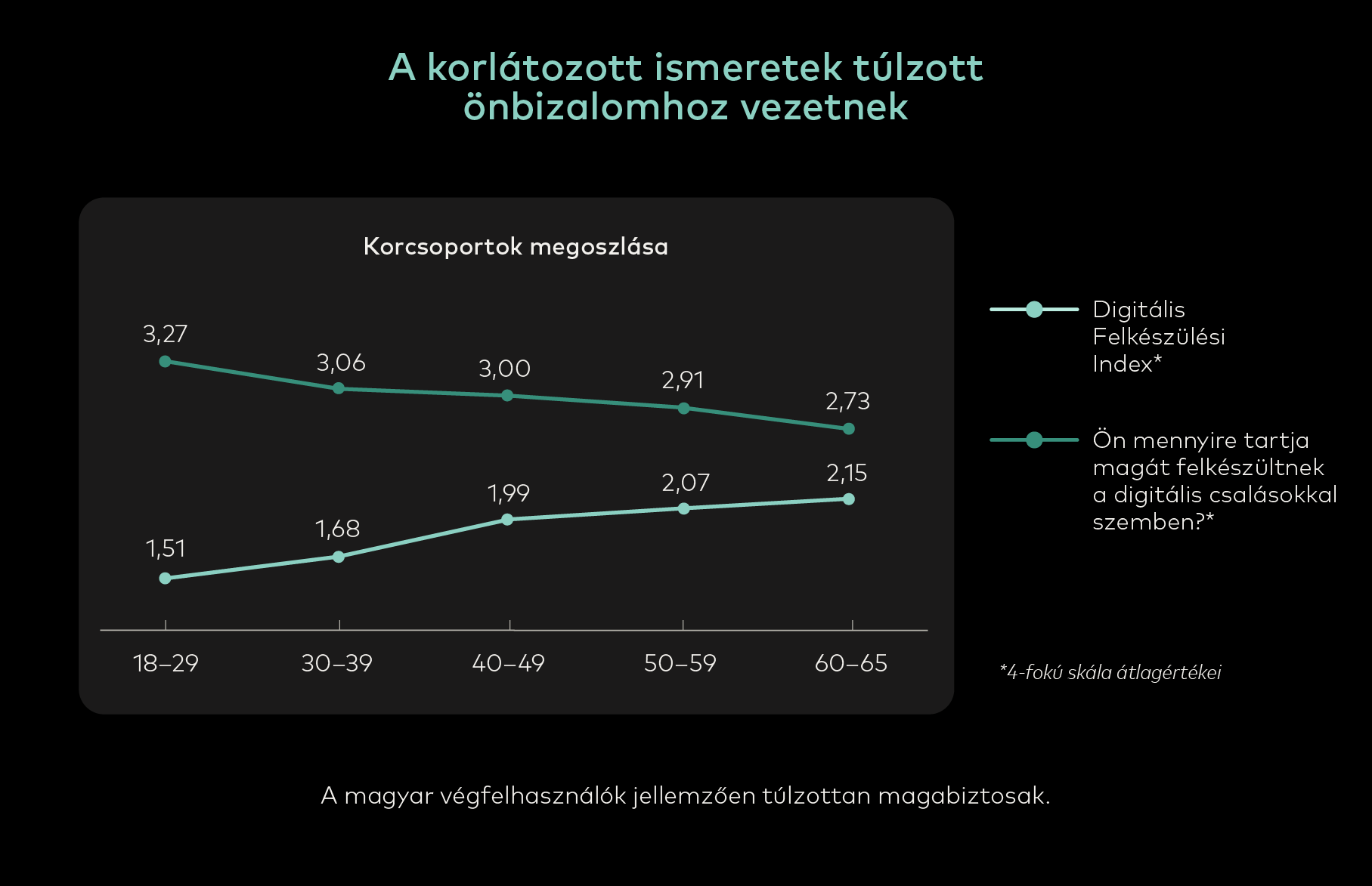 A fiatalok az online térben töltik napjaik nagyrészét, így a téma figyelmük középpontjában áll. Viszont ők túlzottan magabiztosak, ezért kevésbé megfontoltak. Ezzel szemben az idősebb korcsoportok, akik már jelentősebb vagyonnak rendelkeznek és így veszélyeztetettebbek, kevésbé magabiztosak.