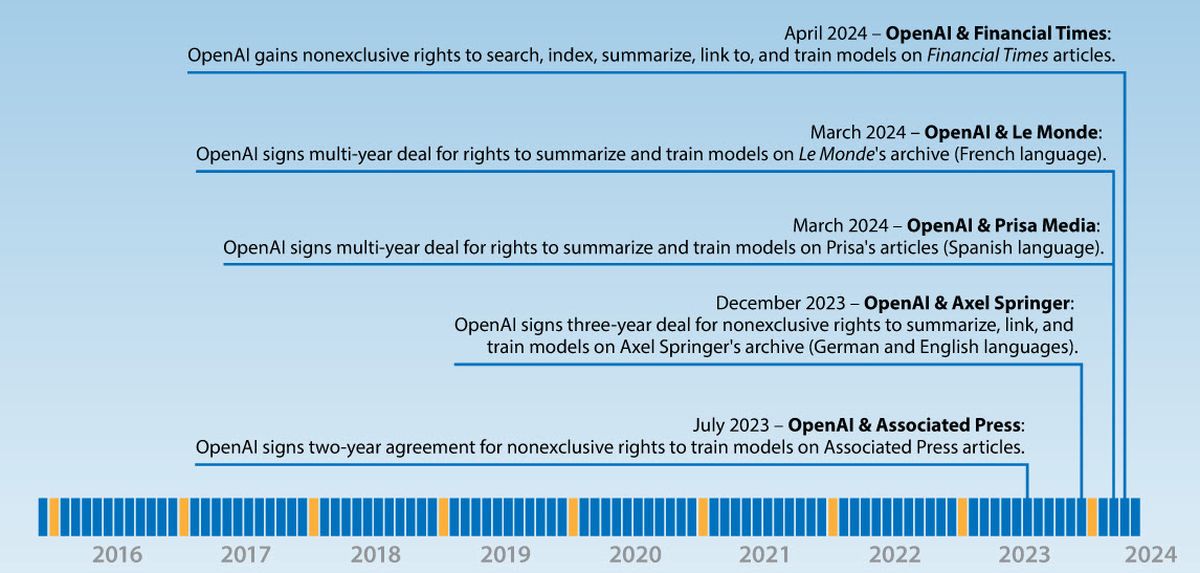 Mesterségesintelligencia-fejlesztőknek egyre komolyabb adatmennyiségre van szükségük terebélyesedő modelljeik gyakoroltatásához. Ezeknek a vizuális, hang, szöveges, multimédiás anyagoknak a forrásai különféle médiafelületek, köztük nagy kiadók, híroldalak, online sajtótermékek hatalmas archívumai.